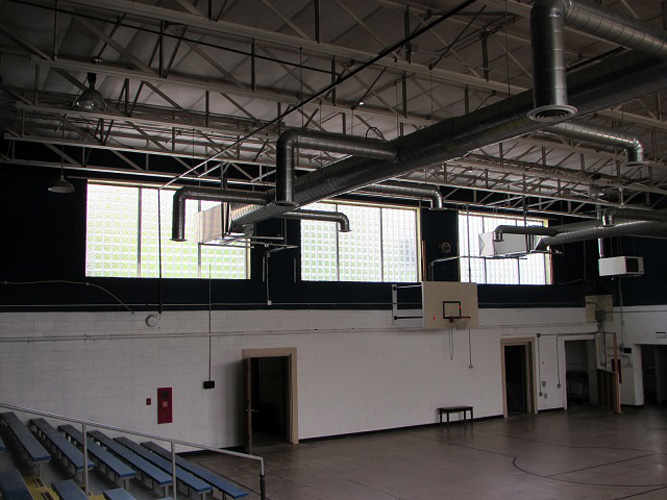 We replaced old aluminum frame windows in the gymnasium at Vermont Elementary. The old windows were poorly sealed allowing the cold winter, and warm summer weather into the gymnasium. The new windows are air-tight and bring a more diffused light into the gymnasium. Not to mention, it’s much quieter inside and out!